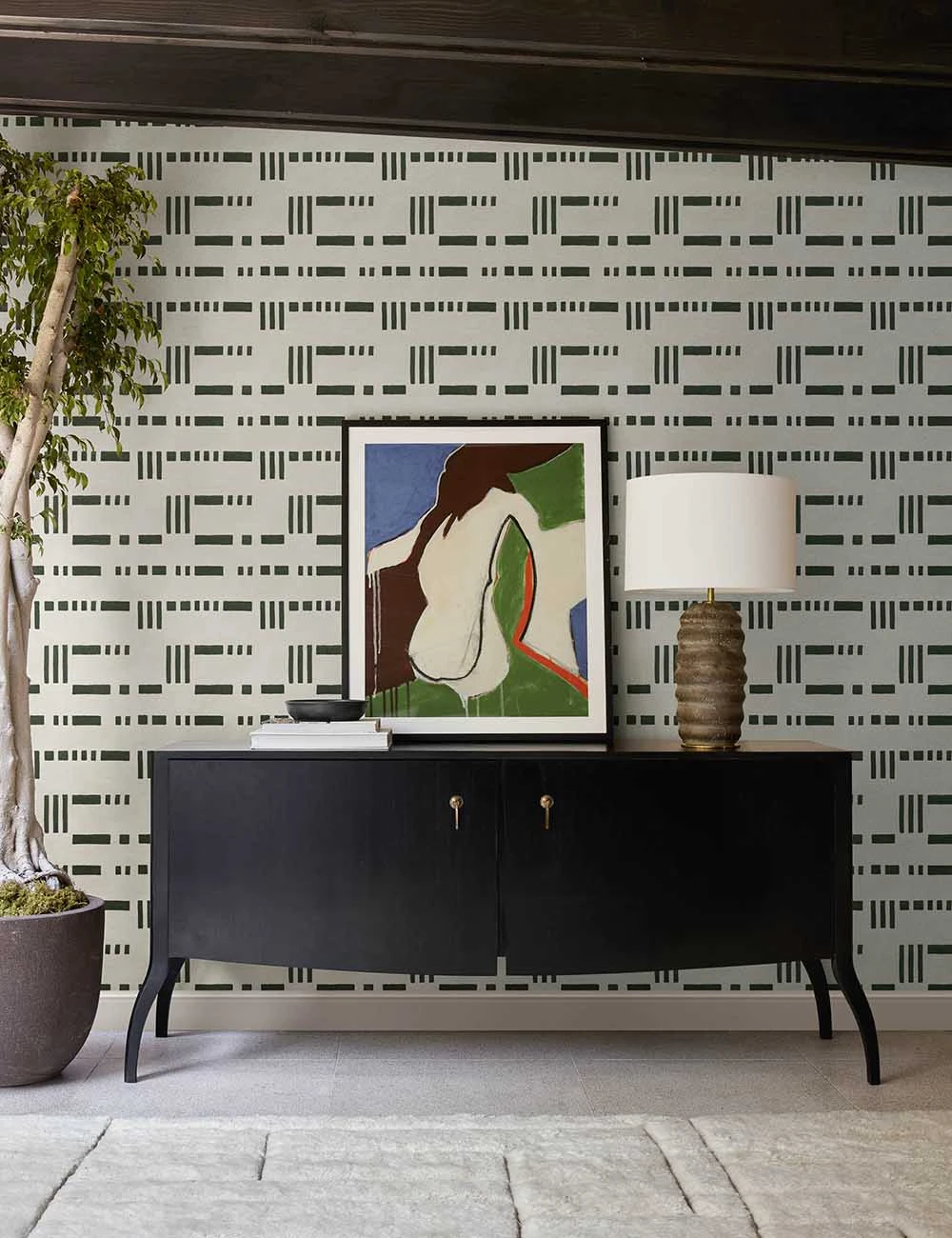 This warm and playful yet balanced design pairs rich hues with a dash and bar motif to offer a refined home wallpaper with chic style notes. Layer this versatile wallpaper into any space in need of a refresh, from the entryway to the bathroom.