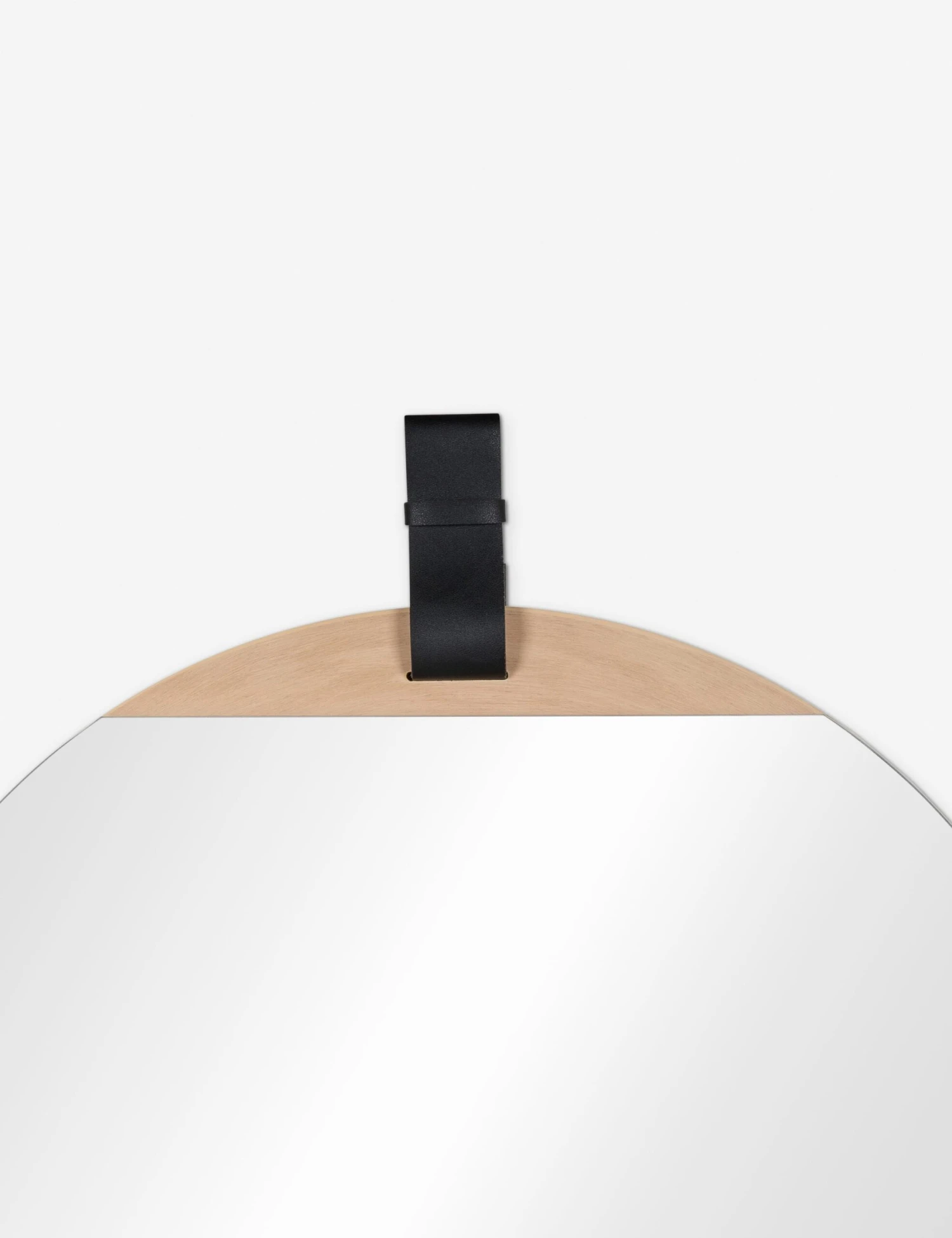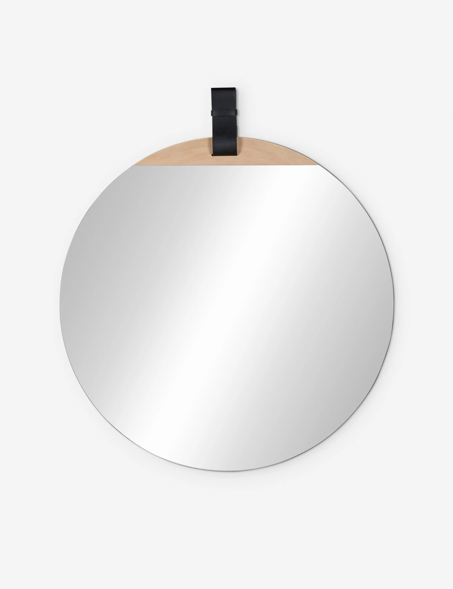 This oval mirror features a contemporary look with natural wood piecing and a black leather hanging element for an equestrian touch.
