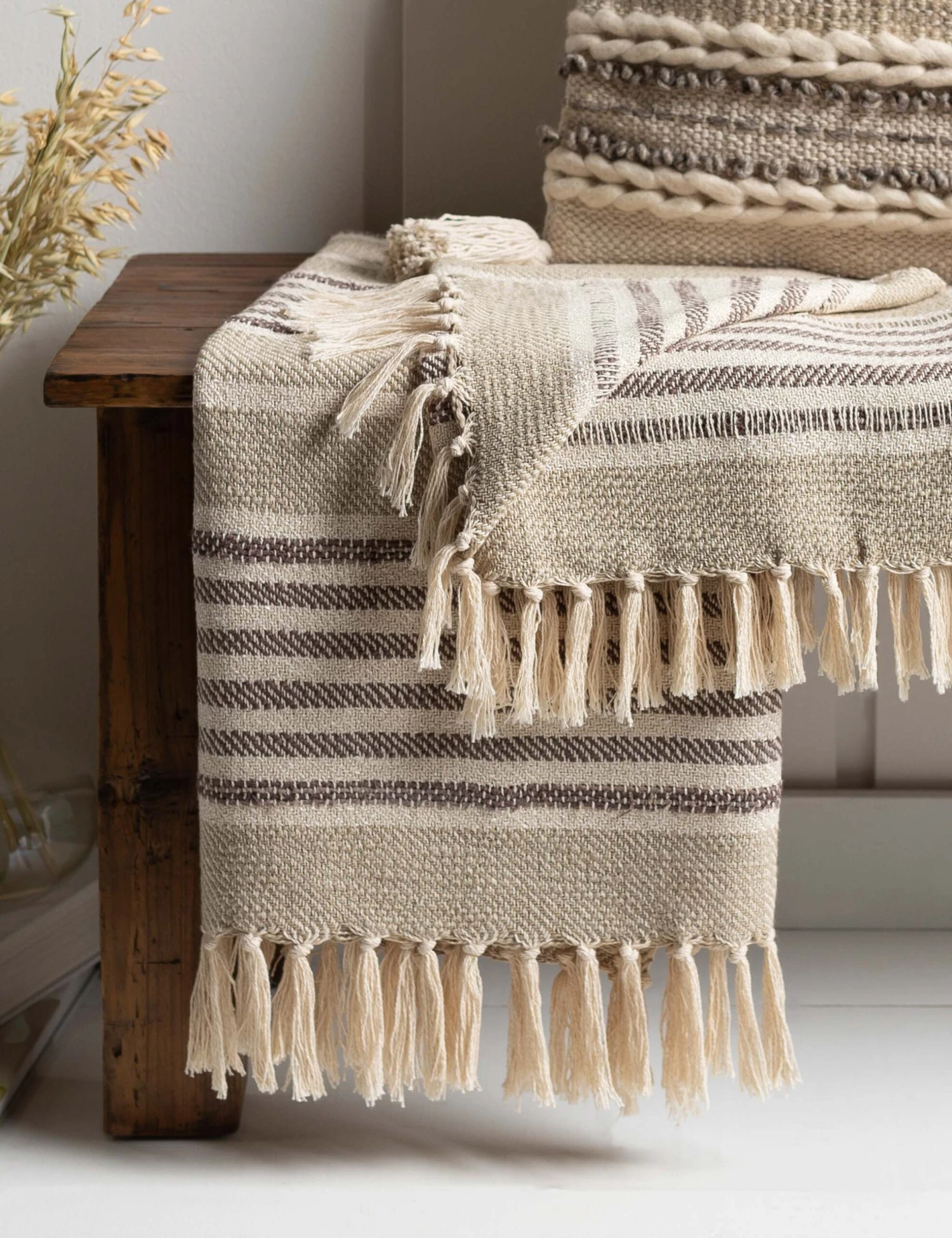 This light cotton throw features a striped design in warm neutral tones that will style seamlessly into your bedroom or living space. The handwoven construction and fringed ends will finish your look with a layer of cozy appeal full of soft, rustic undertones.