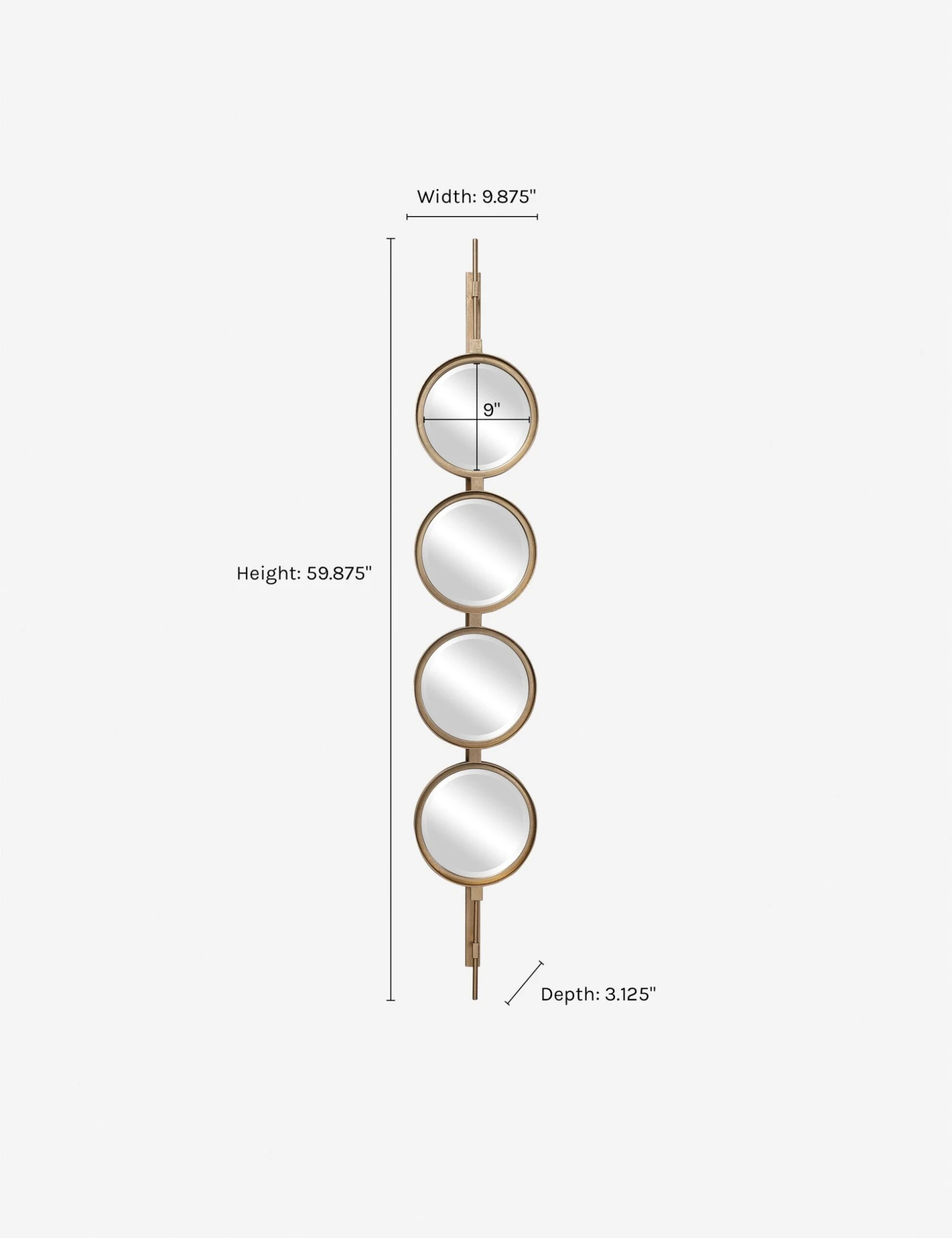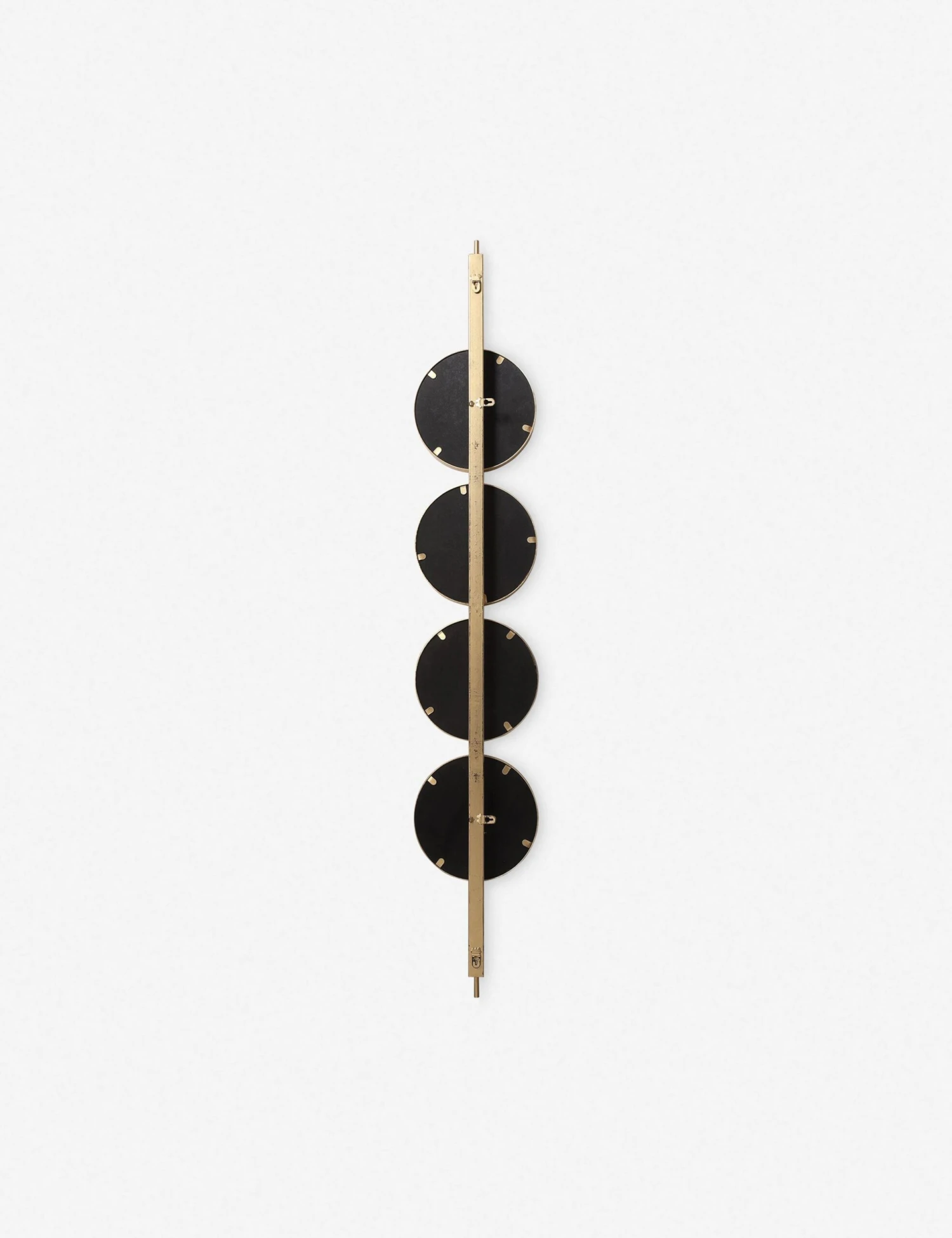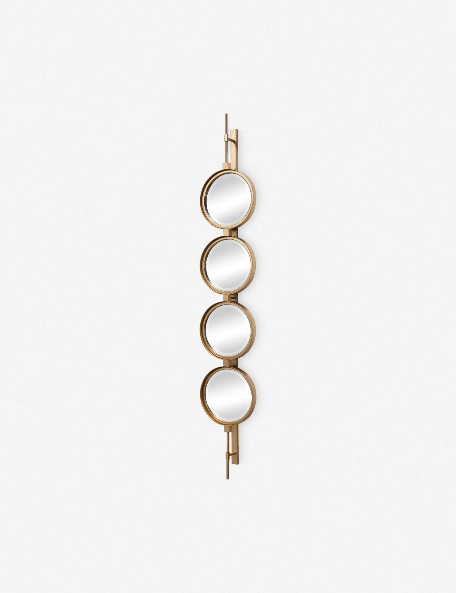 Four round beveled mirrors are set on a sleek iron base, creating a sense of balanced unity. Hang this decorative wall mirror vertically, horizontally, or in multiples to augment your wall decor with a unique and functional design feature.