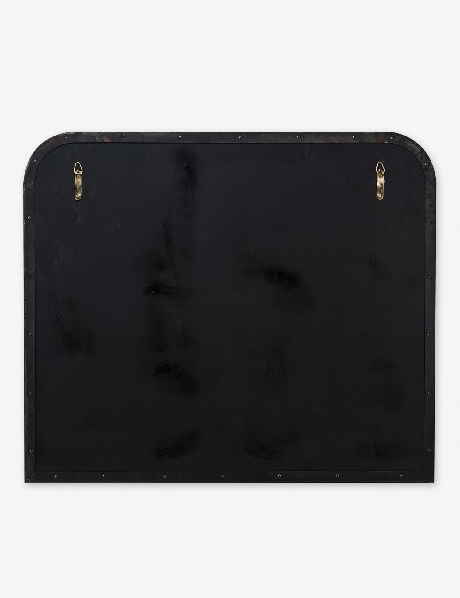 A softer take on modern style, this large wall-mounted mirror features a slim, sleek metal frame and rounded top corners. The flat bottom edge of this modern wall mirror is perfect for styling above bathroom vanity sinks, bedroom dressers, and console tables.