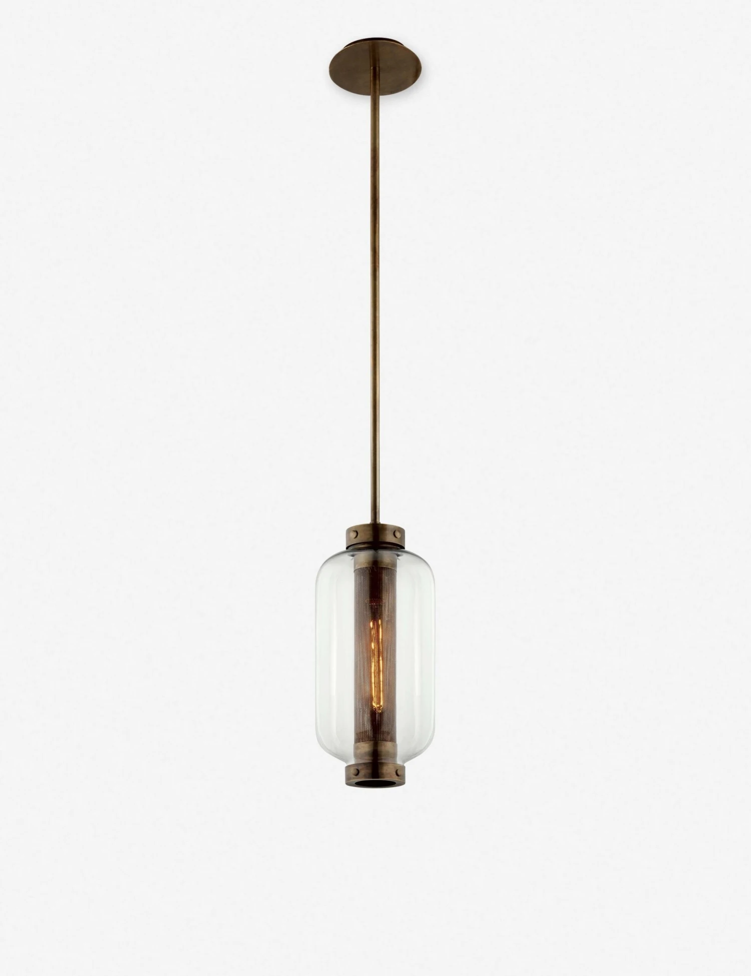 Whether you hang this pendant lamp indoors or out, it makes a serious style statement (and we can’t get enough). The filament bulb, encased in metal mesh, offers a soft, subtle glow, which contrasts beautifully with a clear glass shade and industrial vintage brass hardware.