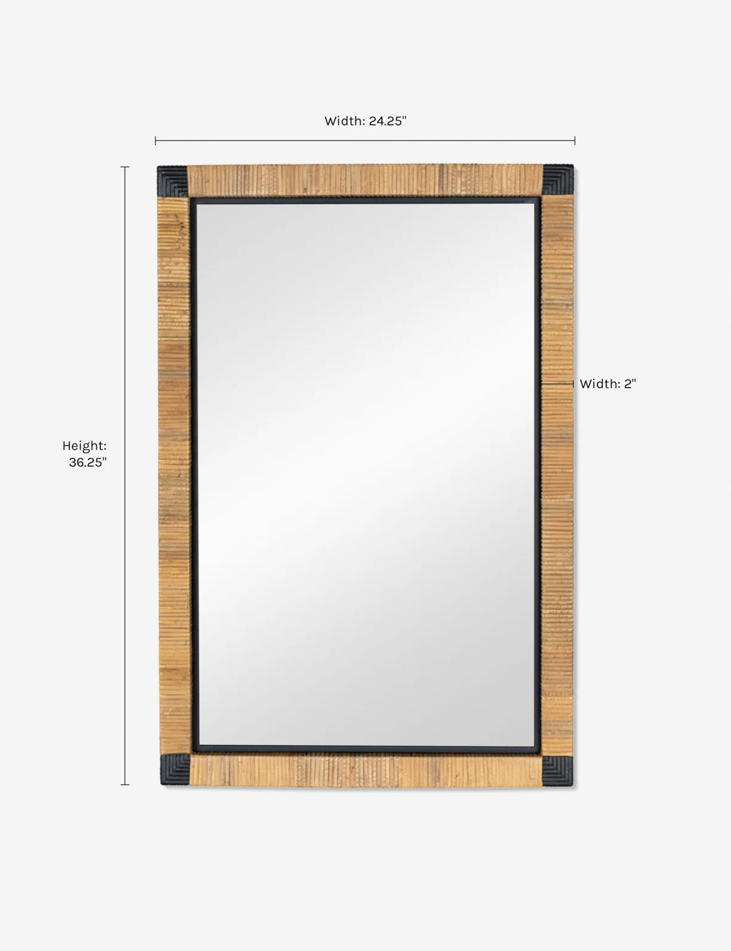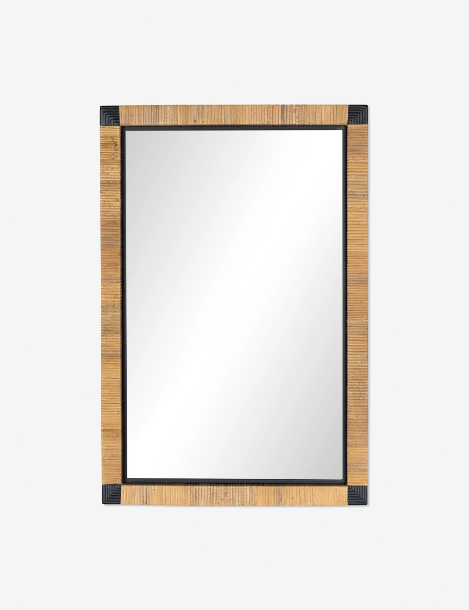 An eye-catching design strikes a balance of texture and tone in this decorative wall mirror. The rattan frame offers natural warmth while black corner accents create a touch of contrast. Style this mirror for a casually refined look in your entryway or living space.